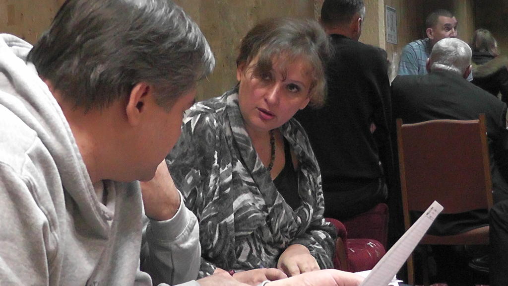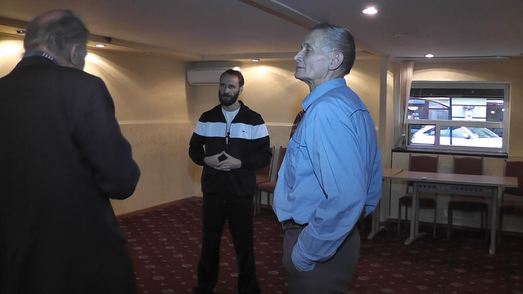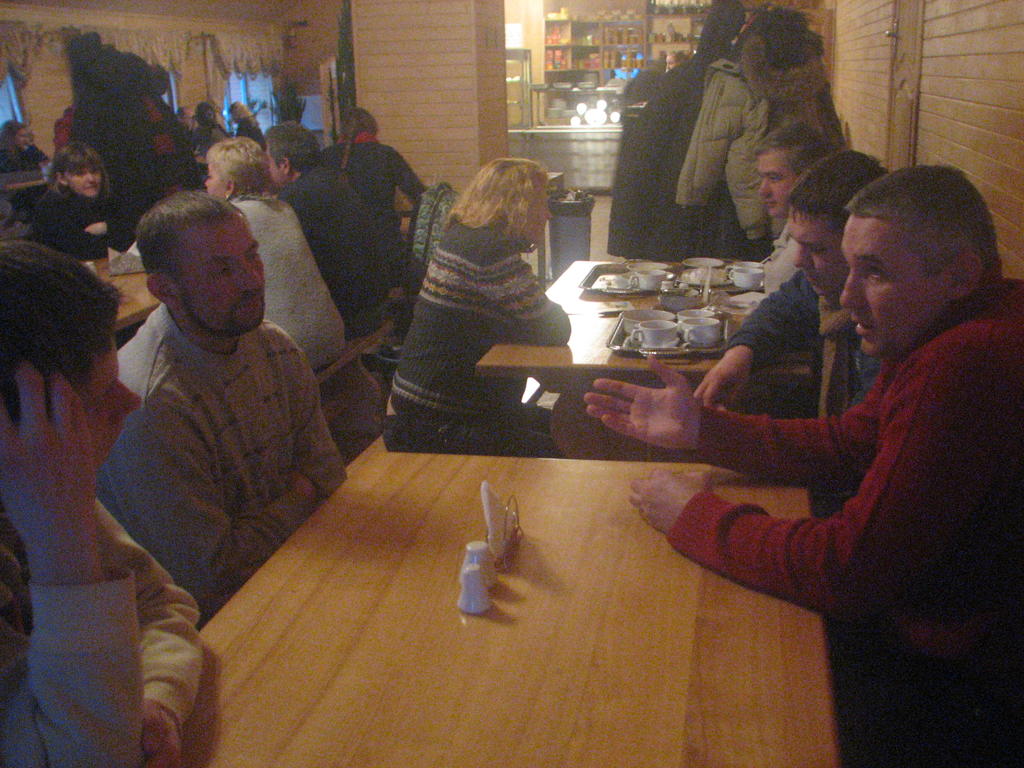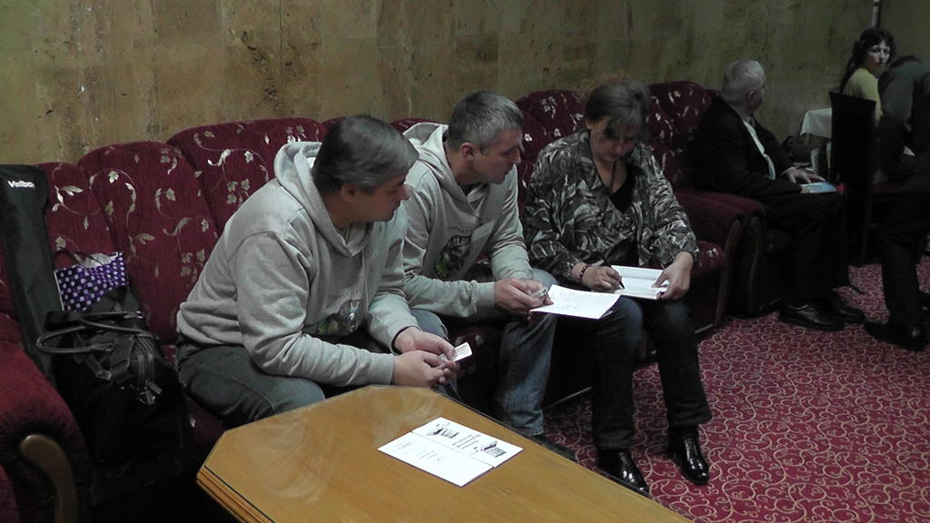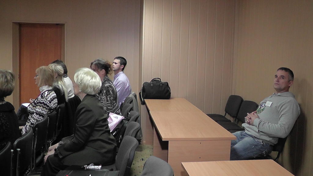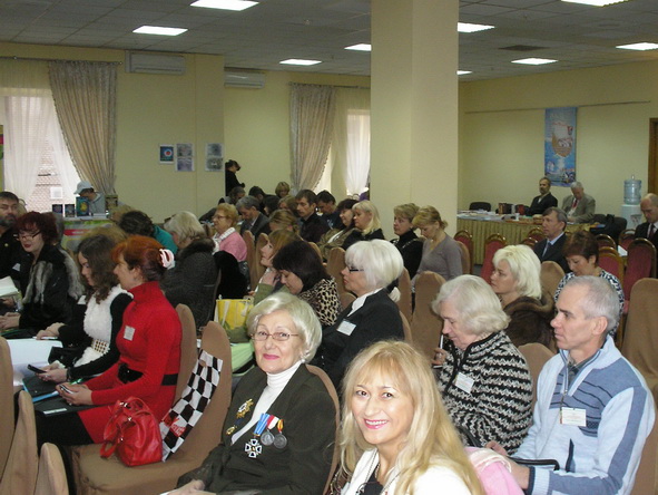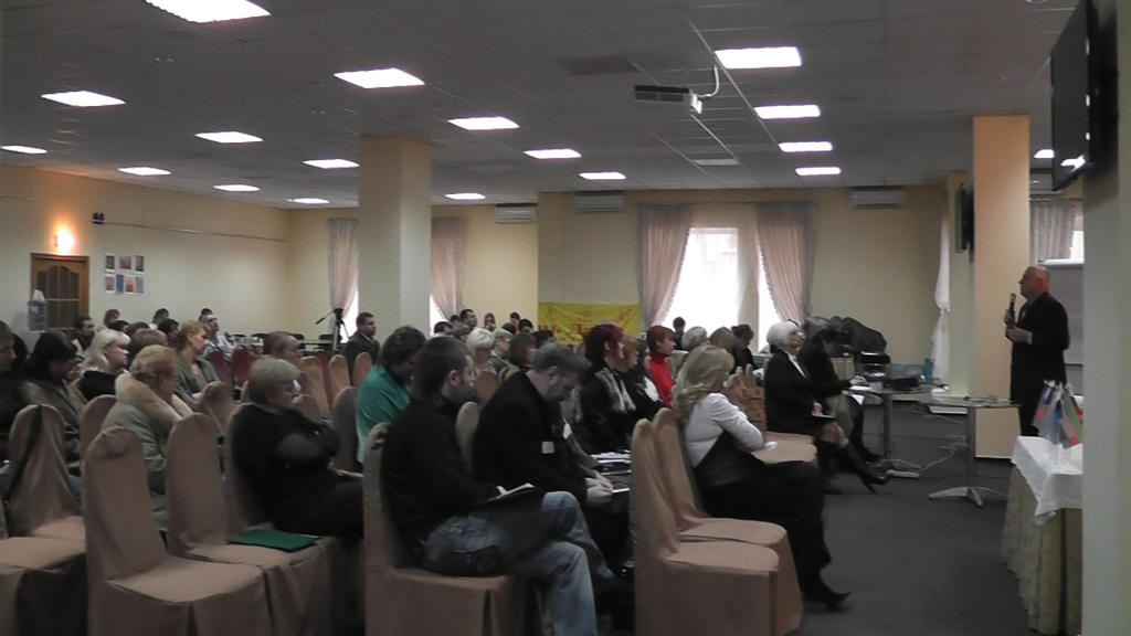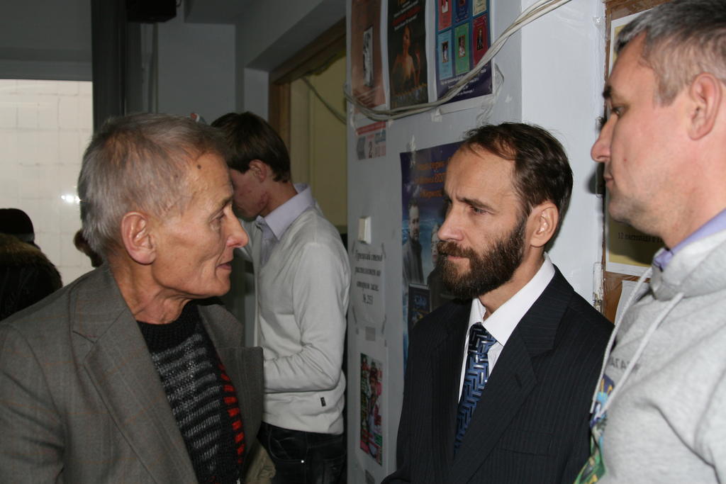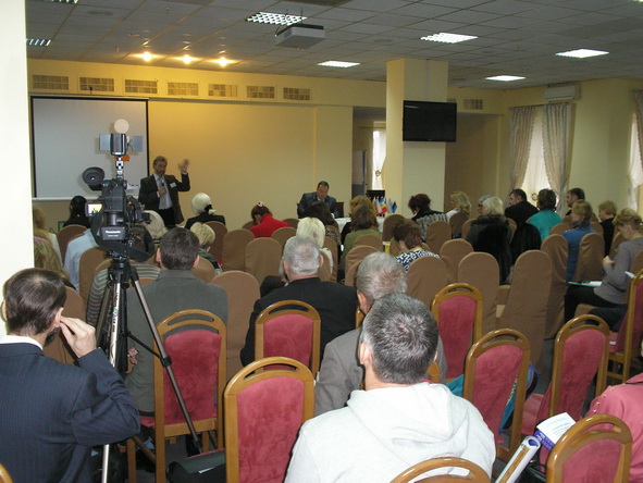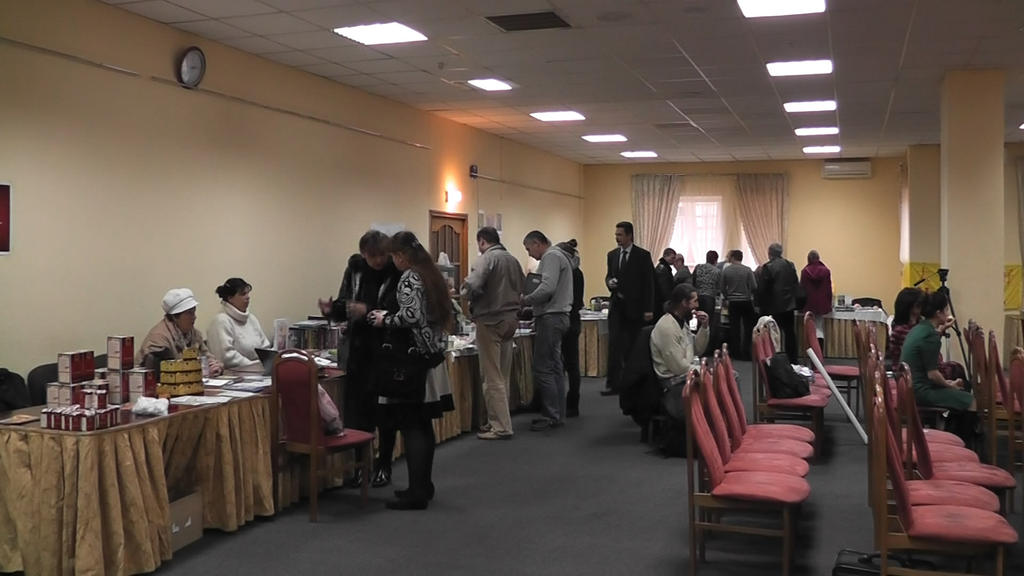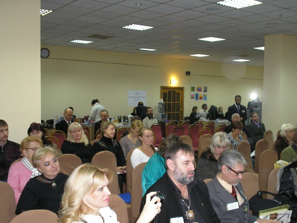 Взято с фотоотчета официального сайта. На фотографиях видны: наш стол, Женя и Сергей. Я со спины во время съемки и лицом во время мастер-класса. Зал. Столы. Обсуждения в фойе.