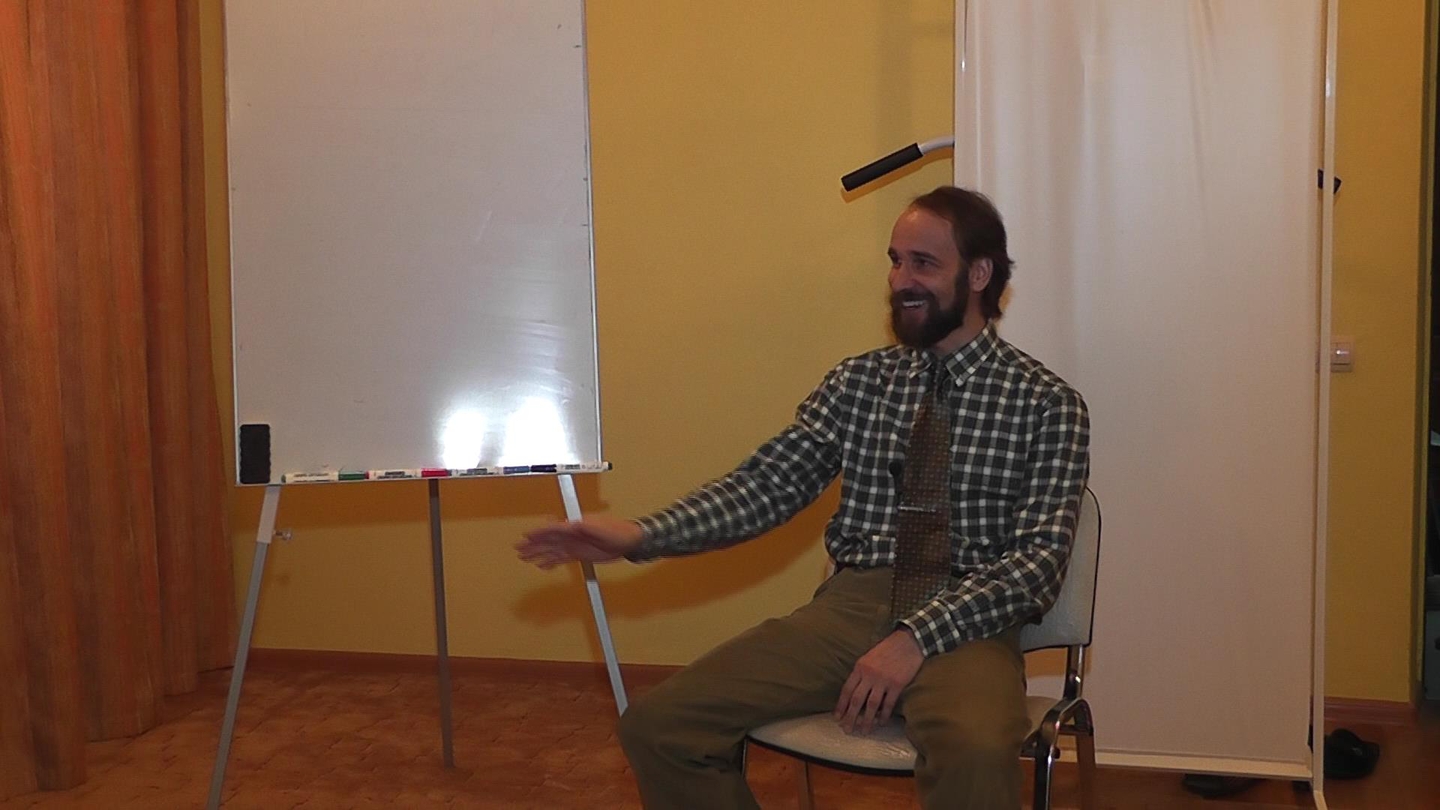 В этот раз отчего-то темно и уже в какой раз повторяется неверная композиция кадра, когда Саошиант сидит. То есть взят мальберт почти целиком. Когда Саошиант рисует это абсолютно оправдано и верно, но когда он сидит, столько "неба" абсолютно не нужно, лучше взять Саошианта крупнее, и вместо ненужного белого полотна зритель точнее увидит мимику говорящего.