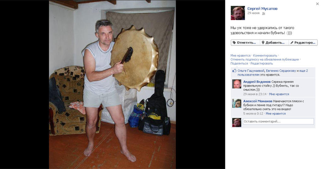 Однако зато нам удалось поиграть всем вместе :) Я всегда считал, что музыку надо не слушать, а играть. Что не должно быть такого, что один на сцене, а остальные в зале. Все должны участвовать в музыке. Поскольку пассивное восприятие музыки не может сравниться с активным участием в ней. А такие инструменты как бубен и варган они помогают интуитивно настраиваться на ритмическую волну без задействования разума.
