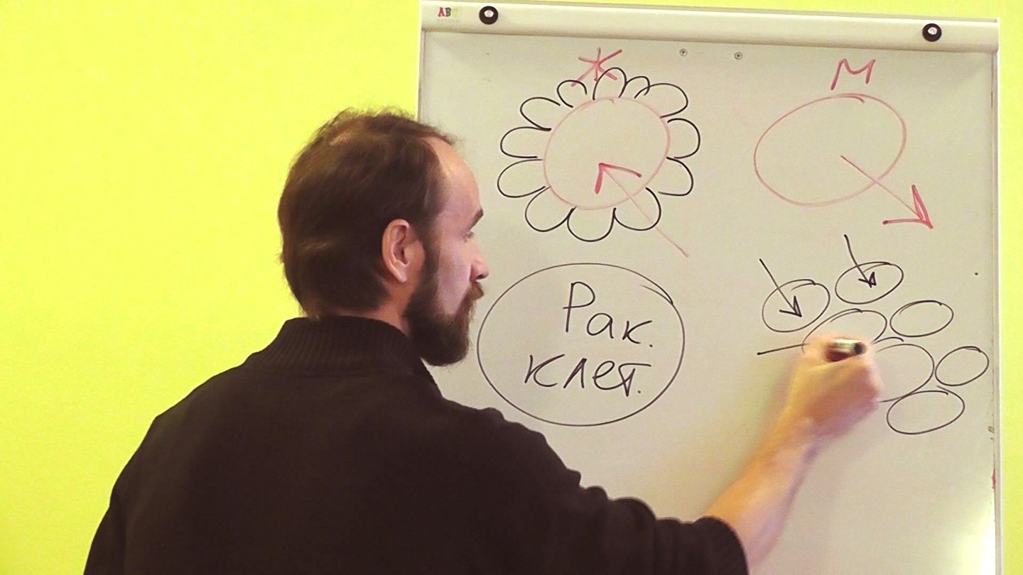 Как только меняется ориентир вот этот, процессы происходят в обратную сторону. То есть, вместо всех вот этих вот, у женщина, например, извне в не идущих процессов, начинаются из неё вовне идущие процессы. Клетка становится агрессивной. То есть, она начинает завоёвывать. Она начинает наоборот во внешнее пространство что-то давать, и вот это вот как бы передача из клетки в клетку нарушается. И тогда получается что как бы каждая клетка пытается выжить за счёт чего? Она берёт не из другой клетки, она пытается взять из окружающего пространства, ну, из этого, межклеточного.