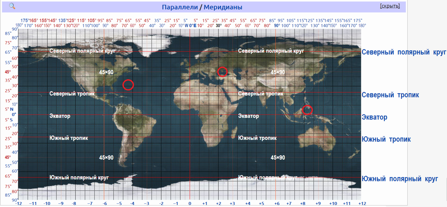 Расстояние от экватора до полюса составляет 90 градусов. Таким образом на таком расстоянии от Крыма (учитывая что направление экватора уже известно), оказались области рядом с Новым Орлеаном с одной стороны, и область Индонезии с другой.