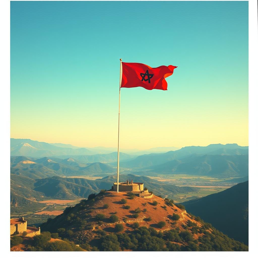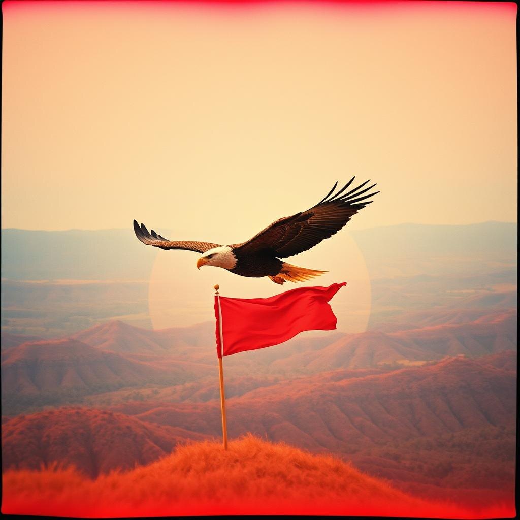 Орлан (символ США) над красным флагом. Гористая местность, напоминающая пейзажи Ирана