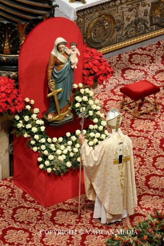 Пролог четвёртого Евангелия также является гимном, и его главным героем является Слово Божие. «Слово» — это слово, которое действует. Это характерная черта Слова Божия: оно никогда не бывает безрезультатным. При ближайшем рассмотрении многие наши слова также производят эффекты, иногда нежелательные. Да, слова действуют. Но вот неожиданность, которую преподносит нам рождественская литургия: Слово Божие является и не может говорить; Он приходит к нам как новорождённый младенец, который лишь плачет и рыдает. «Он стал плотью» ( Ин.  1:14), и хотя Он вырастет и однажды научится языку Своего народа, сейчас говорит лишь Его простое, хрупкое присутствие. «Плоть» — это радикальная нагота, которая в Вифлееме и на Голгофе лишена даже слова; так много братьев и сестёр, лишённых достоинства и низведённых до молчания, лишены слов. Человеческая плоть требует заботы, призывает к принятию и признанию, ищет рук, способных на нежность, и умов, готовых слушать, желает добрых слов.