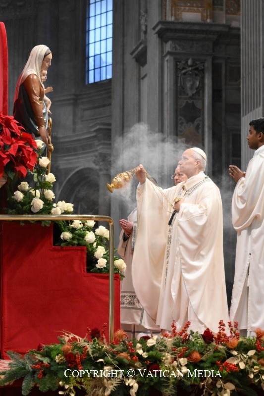 Литургия Первой Вечерни Божией Матери необычайно богата, что обусловлено как головокружительной тайной, которую она воспевает, так и её расположением в самом конце солнечного года. Антифоны псалмов и Магнификата подчеркивают парадоксальное событие рождения Бога от девы, или, наоборот, божественного материнства Марии. И в то же время это торжество, завершающее Рождественскую Октаву, охватывает переход от одного года к другому и распространяет на него благословение Того, «Кто был, Кто есть и Кто грядёт» ( Откр. 1:8). Более того, сегодня мы празднуем её в конце Юбилея, в самом сердце Рима, у гробницы Петра, и поэтому Te Deum, который вскоре разнесётся по этой базилике, захочет расшириться, чтобы дать голос всем сердцам и лицам, которые прошли под этими сводами и по улицам этого города.