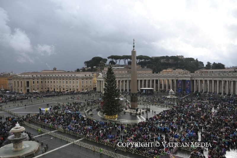 В это второе воскресенье после  Рождества Господня я хотел бы прежде всего вновь пожелать всем вам всего наилучшего. Послезавтра,  с закрытием Святых Врат собора Святого Петра, мы завершим  Юбилей Надежды, и сама Тайна Рождества, в которую мы погружены, напоминает нам, что основанием нашей надежды является воплощение Бога. Пролог Евангелия от Иоанна, который сегодня также предлагается нам в литургии, напоминает нам об этом: «Слово стало плотью и обитало среди нас» (Ин.  1:14). Христианская надежда, по сути, основана не на оптимистических прогнозах или человеческих расчетах, а на Божьем избрании разделить с нами наш путь, чтобы мы никогда не были одиноки на жизненном пути. Это Божья работа: в Иисусе Он стал одним из нас, Он избрал быть с нами, Он хотел быть Богом с нами вечно.