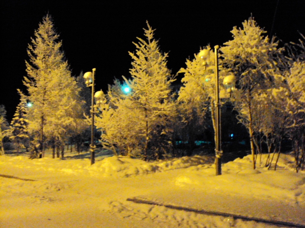 Желтый снег и синие фонари.