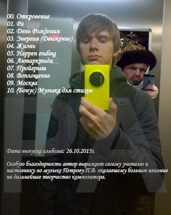 Ра (сентябрь 2015)- это название ей дал еще до обсуждений об арийцах (на форуме Аура - Руса). Записывалась повторно с нуля и приобрела немного другую форму и 2е рождение. Эту композицию не понять с первого раза... она покажется странной, однако окажется не такой уж и простой. Делаем Громче Жизнь - самая свежая (октябрь 2015) Воплощение (зима 2014) Движение (редактировалась с начала 2014го и до сегодняшнего дня) и приобретала разные формы... Москва - немного разнообразит альбом. (Август 2015) "Антарктида" (2014 январь) холодная во всех смыслах композиция так и не получила 2го рождения и планировалась как поздравление ко дню рождения. День Рождения - (август 2015) happen ending (весна - лето 2015) Звуки - самый давний трек - вступление альбома (В альбоме "Ра" именуется как "Откровение") (2013) Движение (2014 - осень 2015) Винтажные композиции отсутствуют но еще будут в след. альбомах. Слушаем здесь https://soundcloud.com/aura_rusa | |