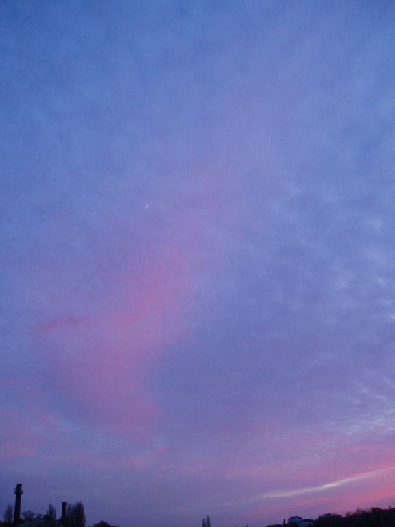 Солнце и растущий месяц подсвечивают облака разными цветами, в результате получаются очень красивые оттенки