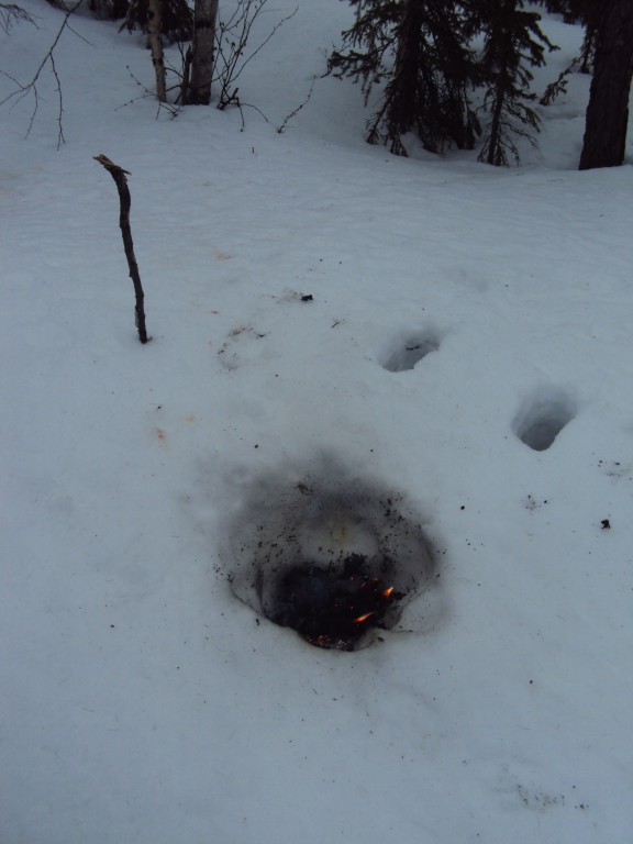 Самое интересное что эта "картина" вышла экспромтом. Я просто разжёг костёр и встал в том месте где получились "глаза", а палочкой "шерудил" угли. Затем отошёл, а потом решил зафотографировать костёр. Первый ракурс получился такой: