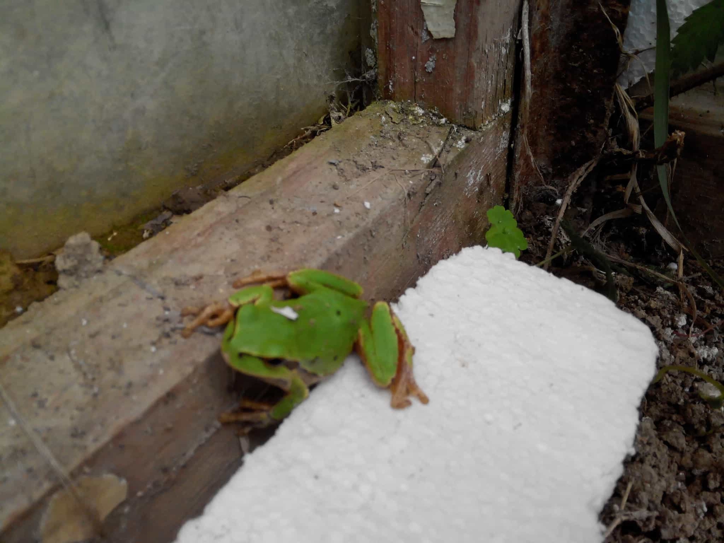 В теплицу пожаловала гостья. Похоже травяная лягушка.