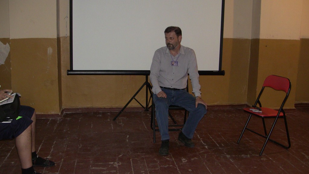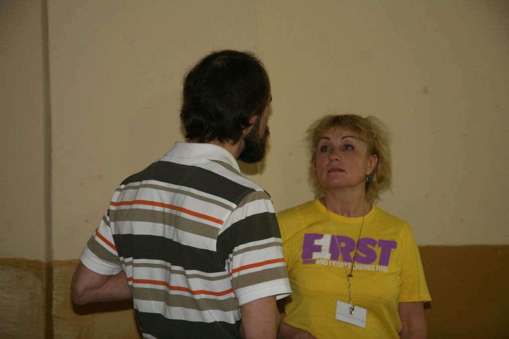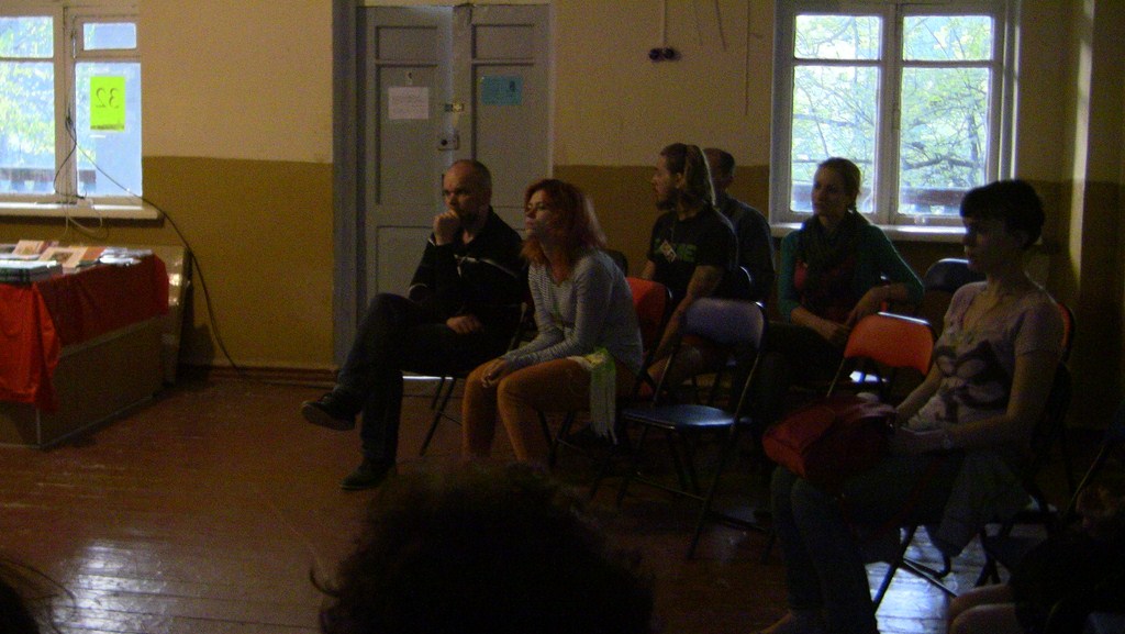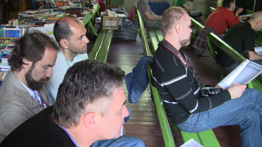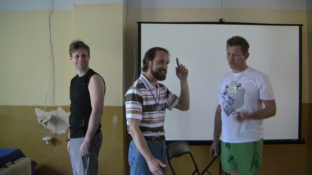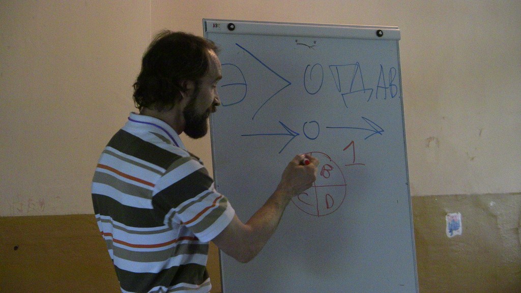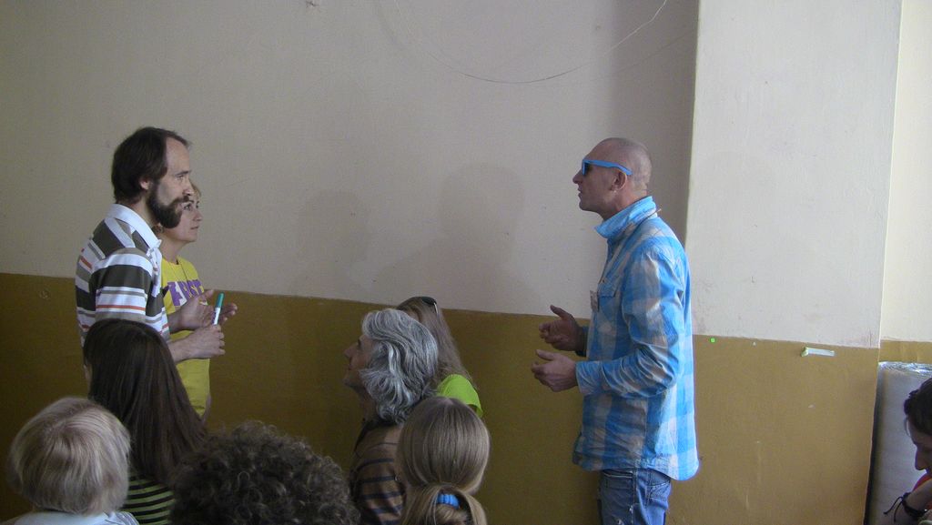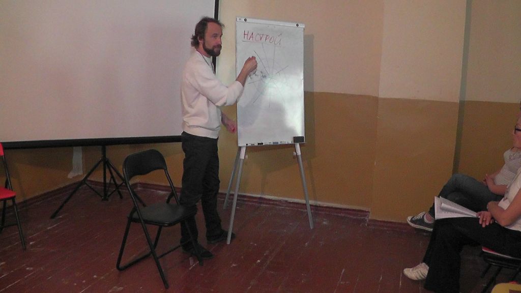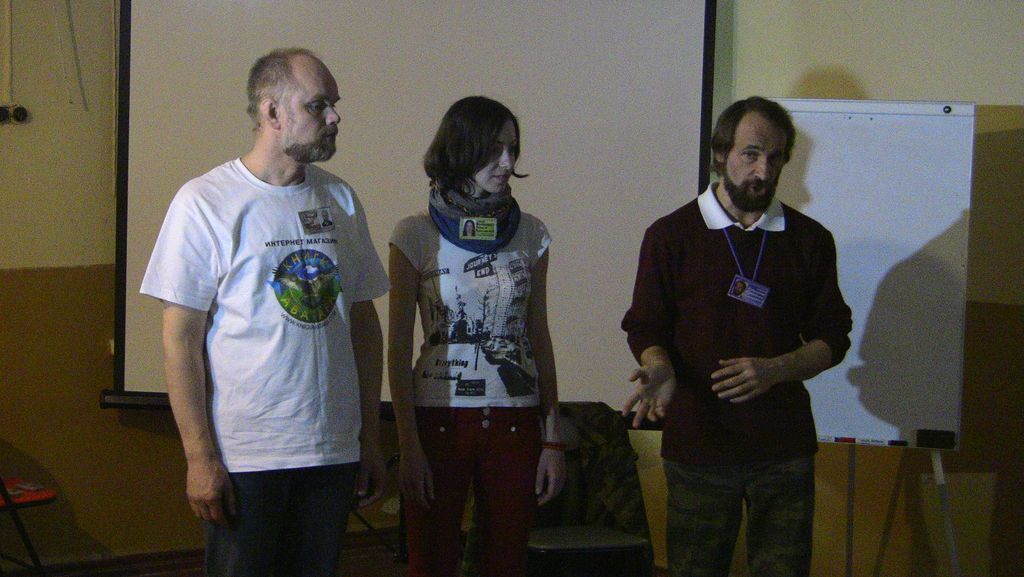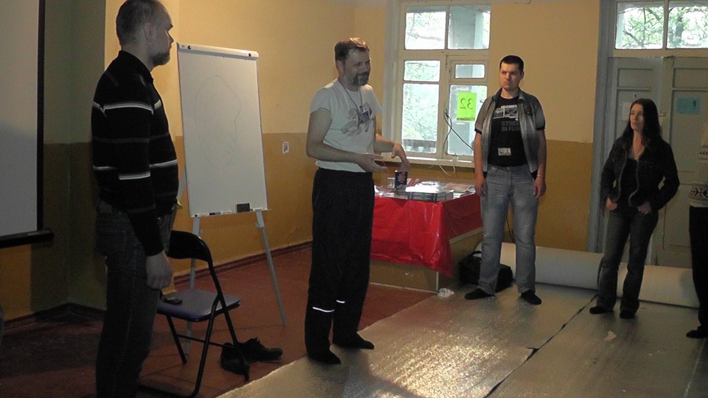 Представление мастер-класса. При хорошем знании предмета все можно объяснить на пальцах. :) Бейджик тренера. Заинтересованные слушатели.Беседа с харьковским поэтом Игорем Березюком. Один из логотипов привлек внимание. Общее фото - символ достигнутого взаимопонимания.