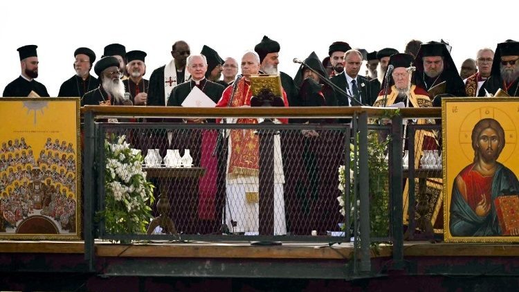 У раскопок древней базилики Св. Неофита Папа Лев XIV, Вселенский Патриарх Варфоломей, главы Церквей и делегаты мировых христианских общин внимали словам Евангелия, провозгласили Никео-Цареградский Символ веры, возносили молитву «Отче наш» и взывали о даре христианского единства.